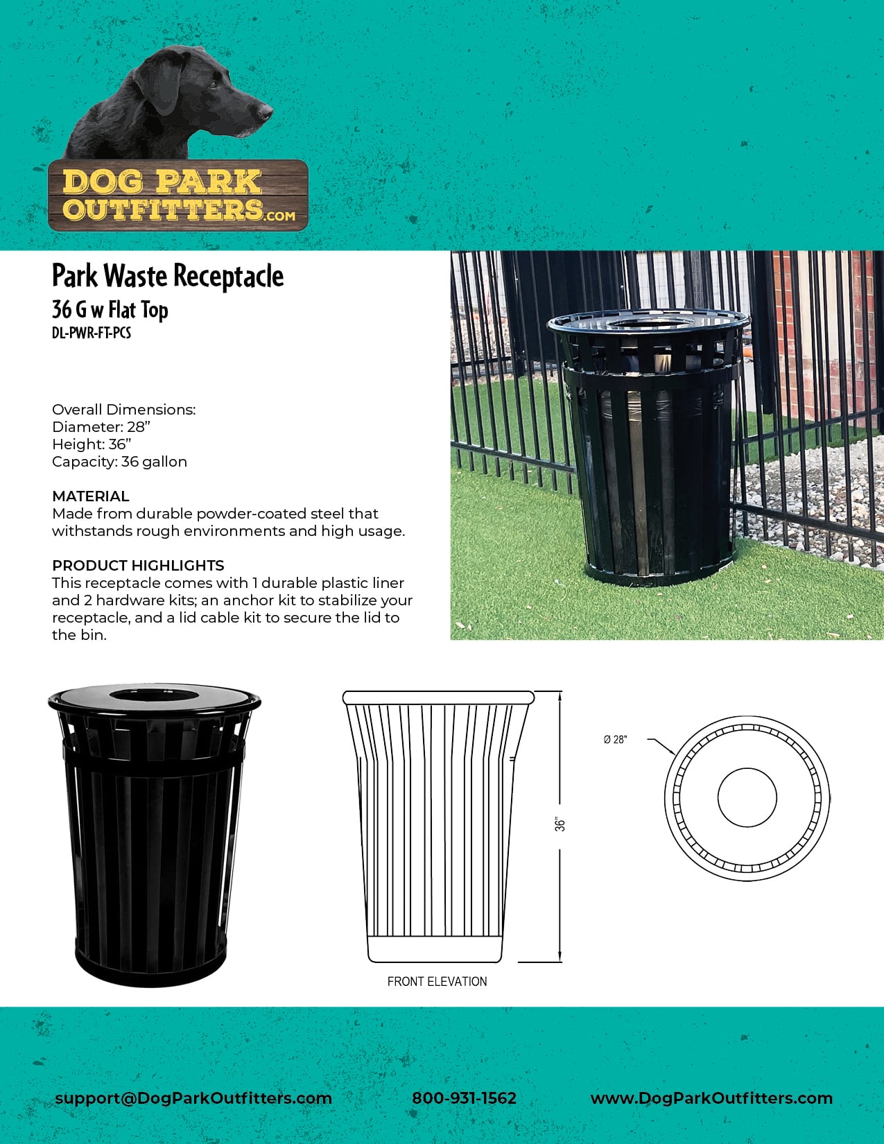 The Park Waste Receptacle is a stylish 36 gallon all welded flat bar steel frame. This product comes with a durable electrostatic powder coat finish in black, with custom color options available. The product comes complete with a black 36G waste can liner with either a rain bonnet lid (RB) or a flat lid (FT) and is portable or surface mounted with leveling feet. All items are guaranteed for one year to be free of defects in workmanship and materials.